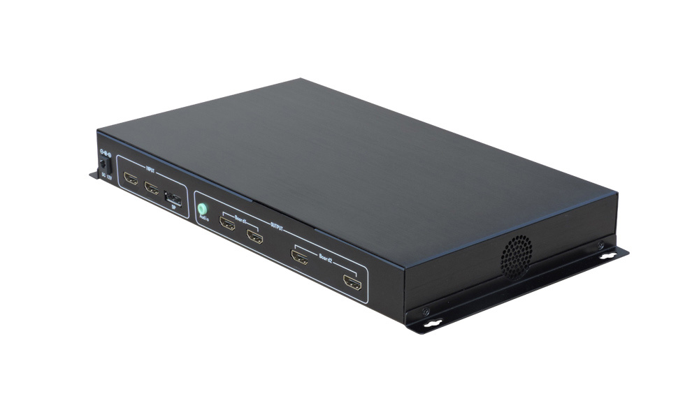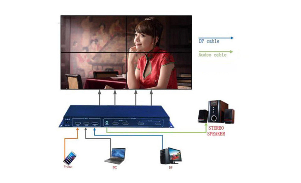 DJV-K10 is a high-performance UHD Ultra HD 4K two displays mosaic, its main function is to 2x2 display unit displays a 3840x2160@60HZ Super high definition images. Products using advanced image processing technology, the input signal can support HD, that is 3840x2160@60HZ, will not appear, even when playing fast animation no delay,no dropped frames.