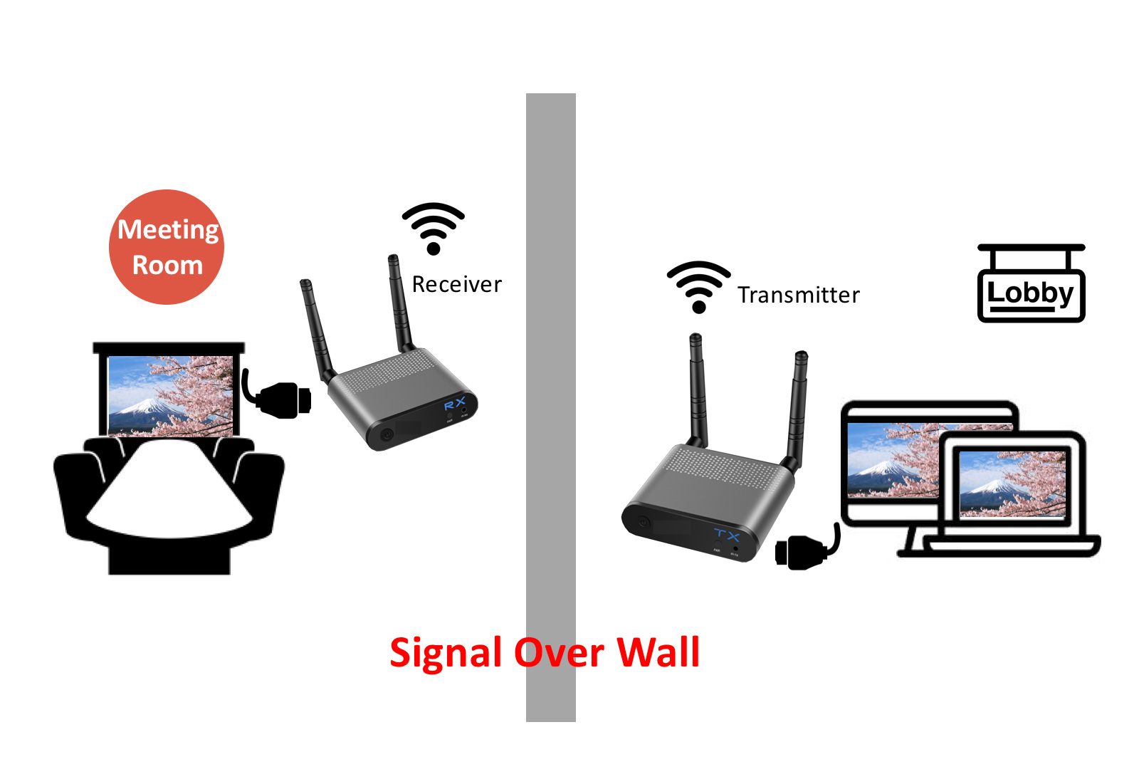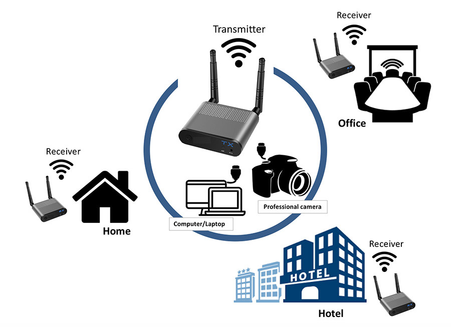 The wireless HD extender extends high-definition video and audio to any HDTV displays up to 100m away. It supports up to 4 displays to show one source content synchronously and resolutions up to Full HD 1080p. The extender transmits send real time video and audio signals with very low latency, allowing user to view the content in other rooms of the house such as bedroom, living room, or kitchen. It also allows user to control source device from display side via source device's remote controller.