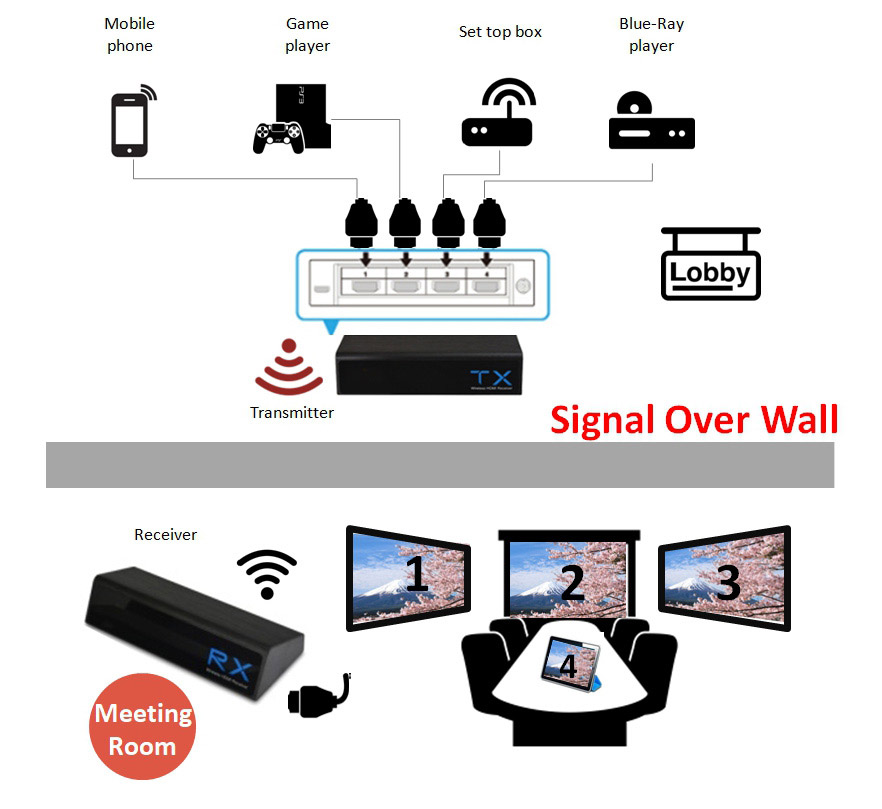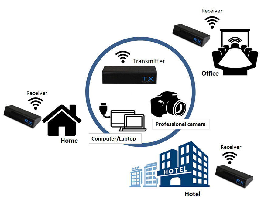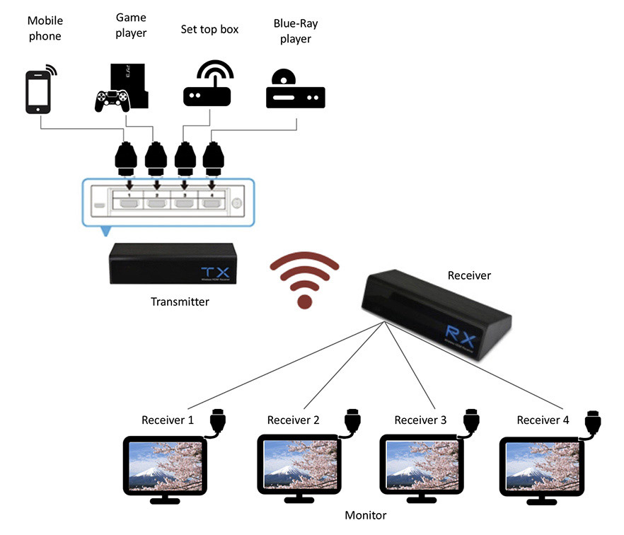 The Multicast HD Wireless Extender extends your HD display up to 100 feet from 4 HD source devices to up to 4 separate receivers (connected to HDTVs) wirelessly, with crystal clear image quality capable of streaming Full 1080P with 7.1 channel HD digital audio and 3D technology. The IR remote control allows you to switch between HD source devices from the transmitter side.Product Feature