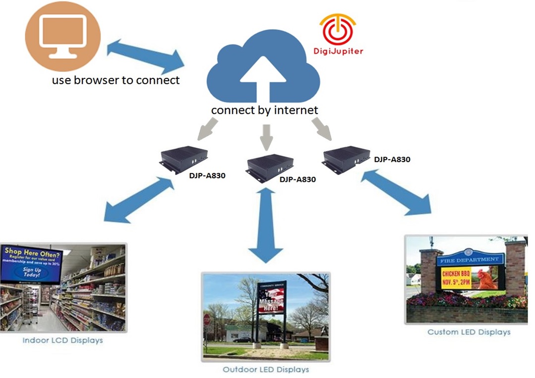 DigiJupiter cloud solution support multi-languages and it is able to edit and update content to thousand digital signage players(PCB) by internet from our cloud. By using our cloud space, user does not need to spend extra costs and time to set up server.