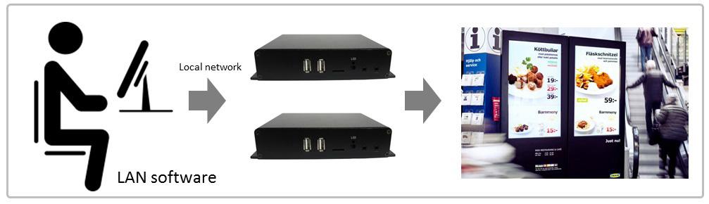 For a small scale deployment, it is advised to use Digi-Jupiter LAN software to compile programs. Programs can be distributed to Digital signage(Player&PCB) via the network or a USB disk. This is especially suitable for such occasions as meeting notifications.